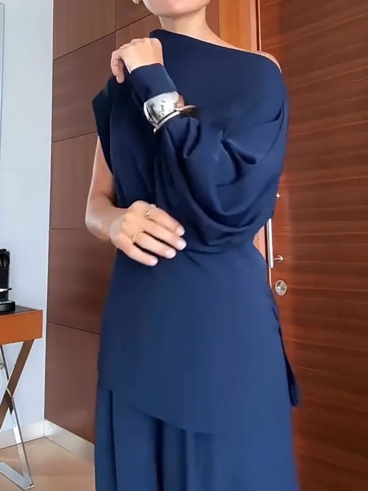 12. Diagonal Collar Long Sleeved Top and Wide Leg Pants Ladies Set